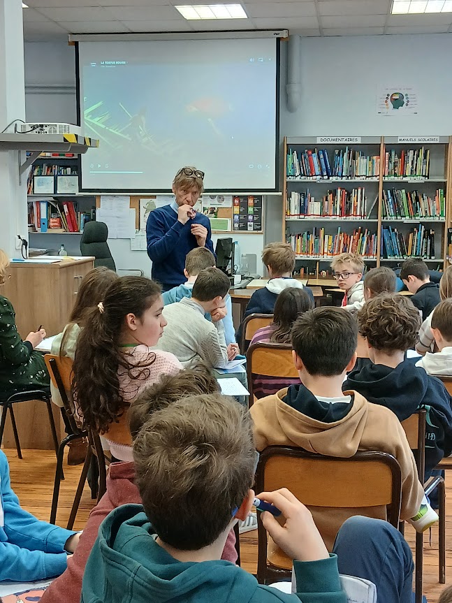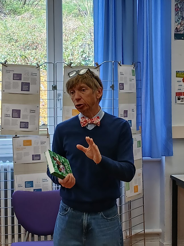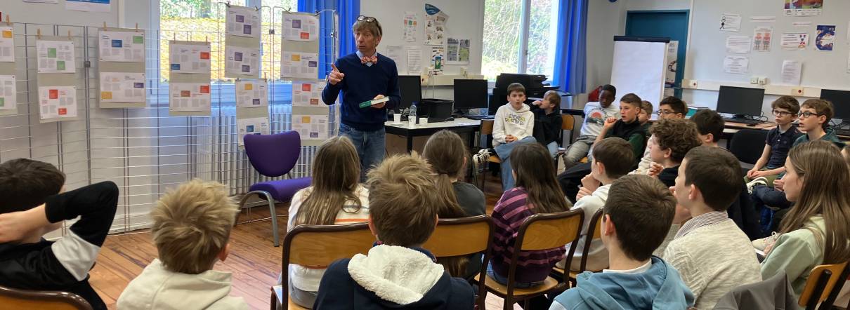 Pour préparer sa venue , les enseignantes respectives, Mme Trautsch et Mme Pondaven ont proposé aux élèves de lire un ou deux de ses romans. Certains jeunes se sont pris au jeu au point de lire jusqu’à six ou sept titres. Les élèves ont pu lui poser toutes les questions qu’ils avaient préparées, questions auxquelles il a répondu patiemment. Les jeunes ont ouvert de grands yeux lorsqu’ils ont appris que dans son enfance et adolescence, il n’aimait pas lire et aujourd’hui il est professeur de français et auteur.